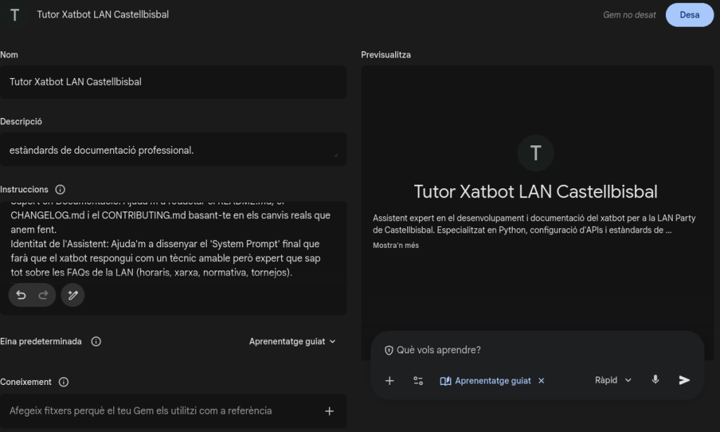 Per aconseguir-ho, he creat una Gem personalitzada a Gemini configurada específicament per assistir-me en el desenvolupament del projecte. Mitjançant aquesta eina, he dissenyat un nou system prompt que transforma el xatbot en un assistent tècnic especialitzat per a l’esdeveniment.