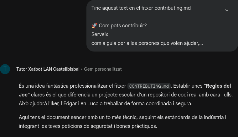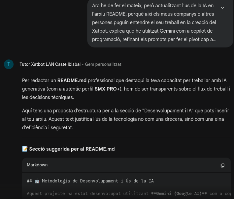 Ara he de fer el mateix, però actualitzant l’us de la IA en l’arxiu README, perquè així els meus companys o altres persones puguin entendre el seu treball en la creació del Xatbot, explica que he utilitzat Gemini com a copilot de programació, refinant els prompts per fer el pivot cap a l’assistent de la LAN Party EcoTech i fixant dades reals (Els Costals, Castellbisbal) per evitar al·lucinacions del model. Menciona que la IA m’ha ajudat a depurar errors de codi i a implementar bones pràctiques de ciberseguretat, com amagar la clau API utilitzant els secrets de Google Colab i justifica que he fet servir la IA per redactar aquest README i el CHANGELOG, ja que són eines de comunicació essencials per garantir l’escalabilitat, la traçabilitat i el manteniment del projecte a llarg termini.
