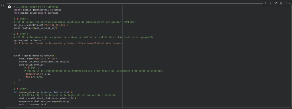 3. **Ciberseguretat:** Implementació de bones pràctiques mitjançant l’ús de **Secrets de Google Colab** (`userdata.get`) per protegir la API Key.