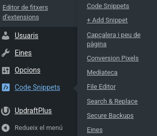 Per fer-ho ens dirigim a “code snippets” i s’obrirà un desplegable, allà fem clic a “Capçalera i peu de pàgina”