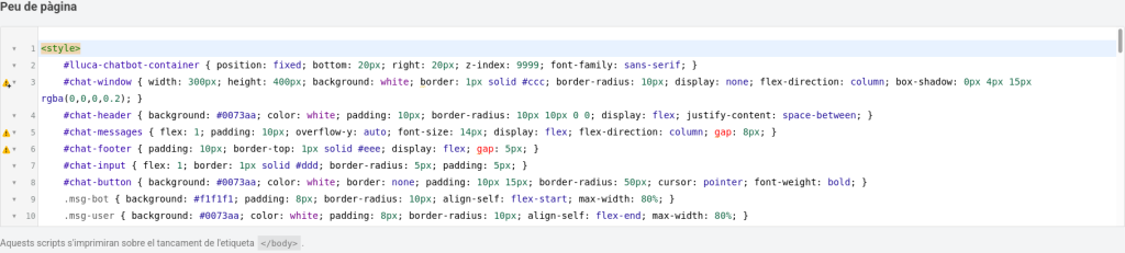Un cop fem clic a”Capçalera i peu de pàgina” baixarem a “Peu de pàgina” i allà li direm a la IA que ens generi un codi de programació HTML,CSS,JS per incrustar al nostre WP. Un cop enganxat el codi farem clic a “Save Changes” i al recargar la pàgina ja ens hauria de sortir el nou XatBot.
