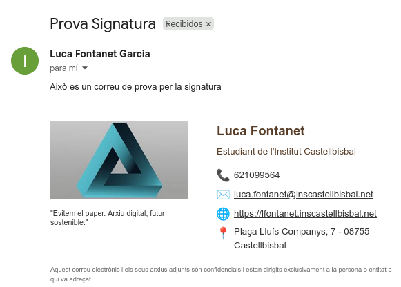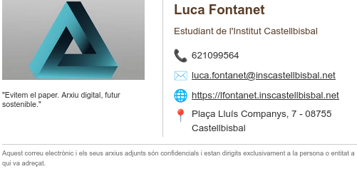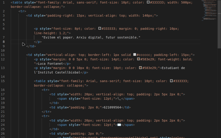 Per crear la signatura he entrat al VisualCode i allà he fet codi html fent servir taules amb l’etiqueta <td> i <tr> per posar la informació com el telefon, el correu i enllaç al portfoli, a més d’una frase sostenible.