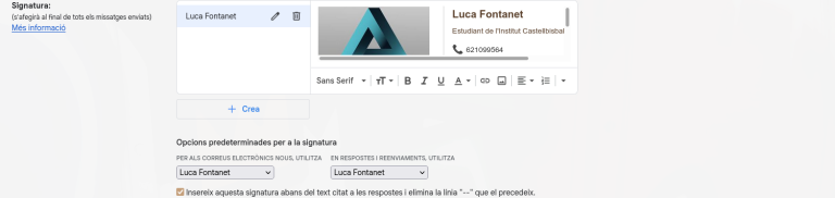 Feu clic al botó Crea, doneu un nom a la vostra signatura i escriviu el text que voleu incloure.