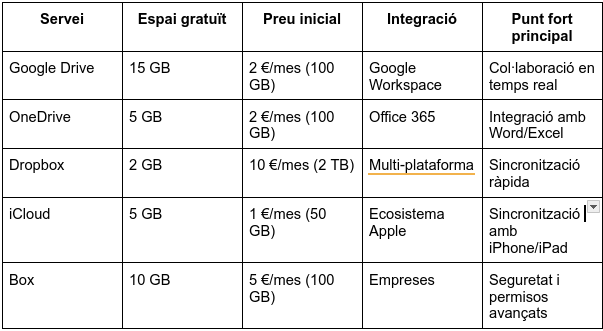 Comparativa de gestors de fitxers al núvol He fet una anàlisi comparativa de tots els gestors de fitxers indicant el servei, espai gratuït, preu inicial, integració i el seu punt fort de cadascú. Torna a espai de treball al núvol