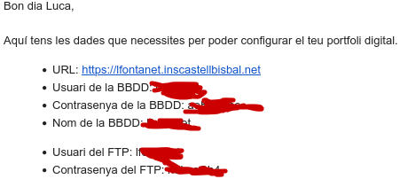 Per fer el desplegament del WordPress ens van enviar un correu amb els usuaris i contrasenyes de l’FTP i del portfoli.