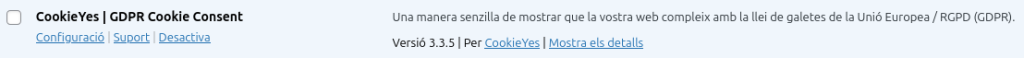 Per fer això he instal·lat el plugin “CookieYes”