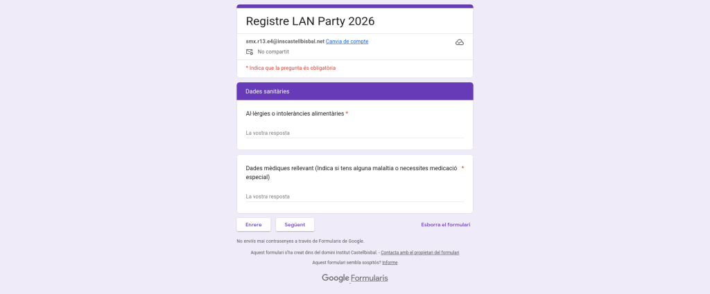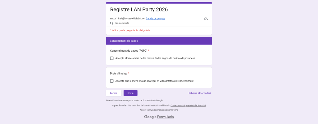 Formulari de Registre Hem fet servir Google Forms per crear el formulari de registre.El formulari recull dades personals, dades sobre la gestió de l’espai i organització, dades sanitàries i privacitat. Dades personals Gestió de l’espai i organització Dades sanitàries Política de privadesa